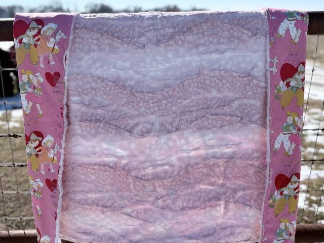 Cowboy Valentine blanket with a pink fawn fox faux fur back. Another gorgeous custom everyday blanket! Size 35”x42”