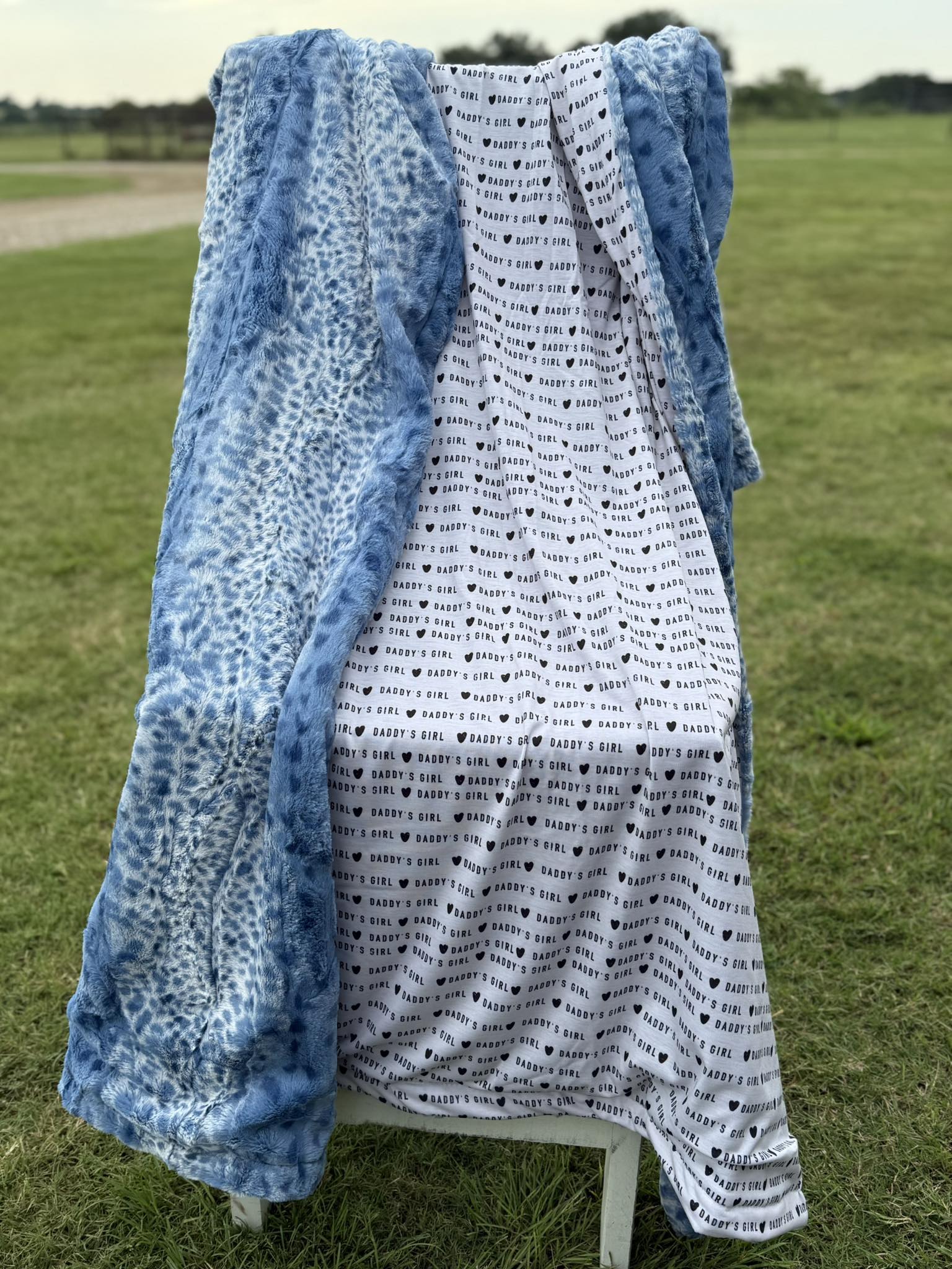 Daddy’s Girl blanket with bluebell fawn faux fur. Another gorgeous custom everyday blanket! Size 55”x71”