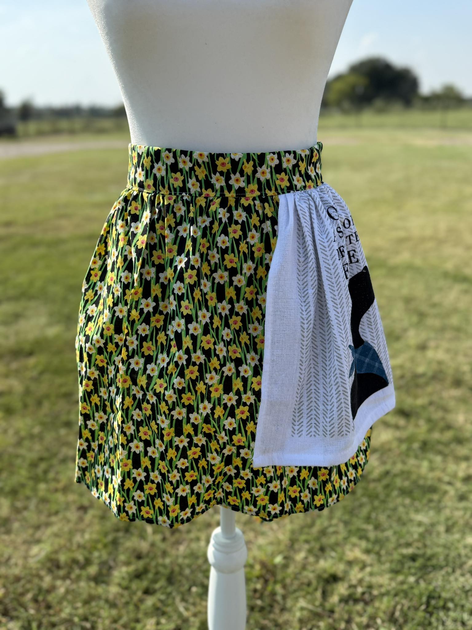 Floral skirt apron with sewen in hand towel! This apron is perfect and ready for your kitchen!